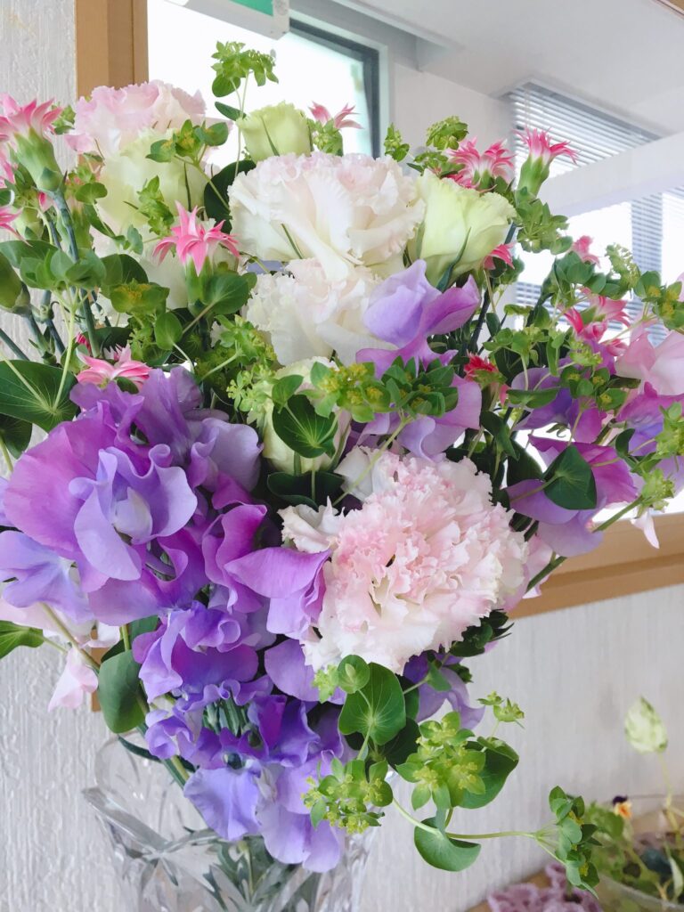待合室のお花も、春らしい淡い彩りでとても可愛いです。気持ちが安らぐ色合いですね。